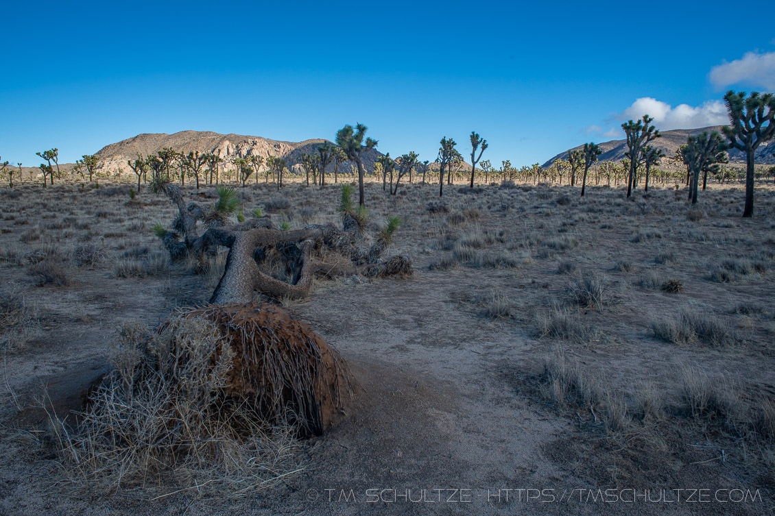 JT250 – Here is an updated report on what NPS is doing to protect the native Joshua Trees.  NOTHING.  The “Kill Zone” along Park Blvd gets more distinct every time I drive through.  You have 10 more fingers than the number of signs in Joshua Tree National Park telling the Instagram crowd not to climb, stand on, mess with, touch, do yoga poses on, any Joshua Trees.  You can easily see the very short and fragile roots of the Joshua Tree plant, similar to the root system of a Giant Sequoia, which also dies by toppling.  While toppling is a natural way for Joshua Trees to die, and a recent storm may have finished this one off, it is quite obvious that human activity is causing most of these along the road to perish early.