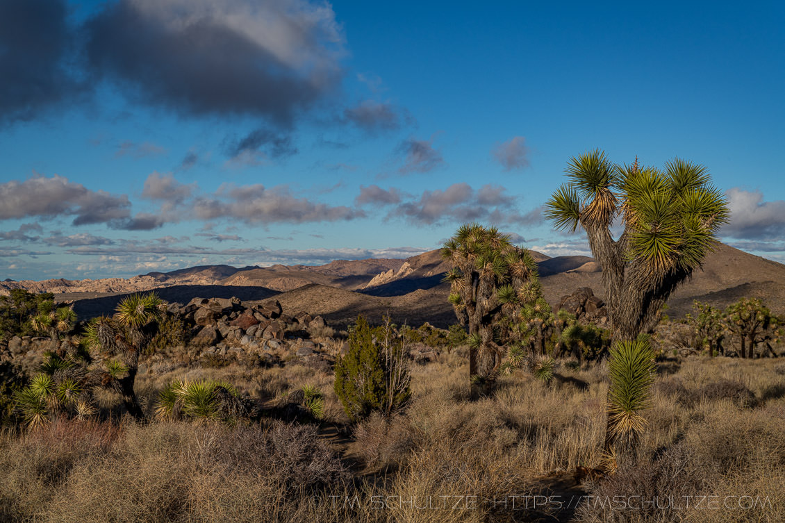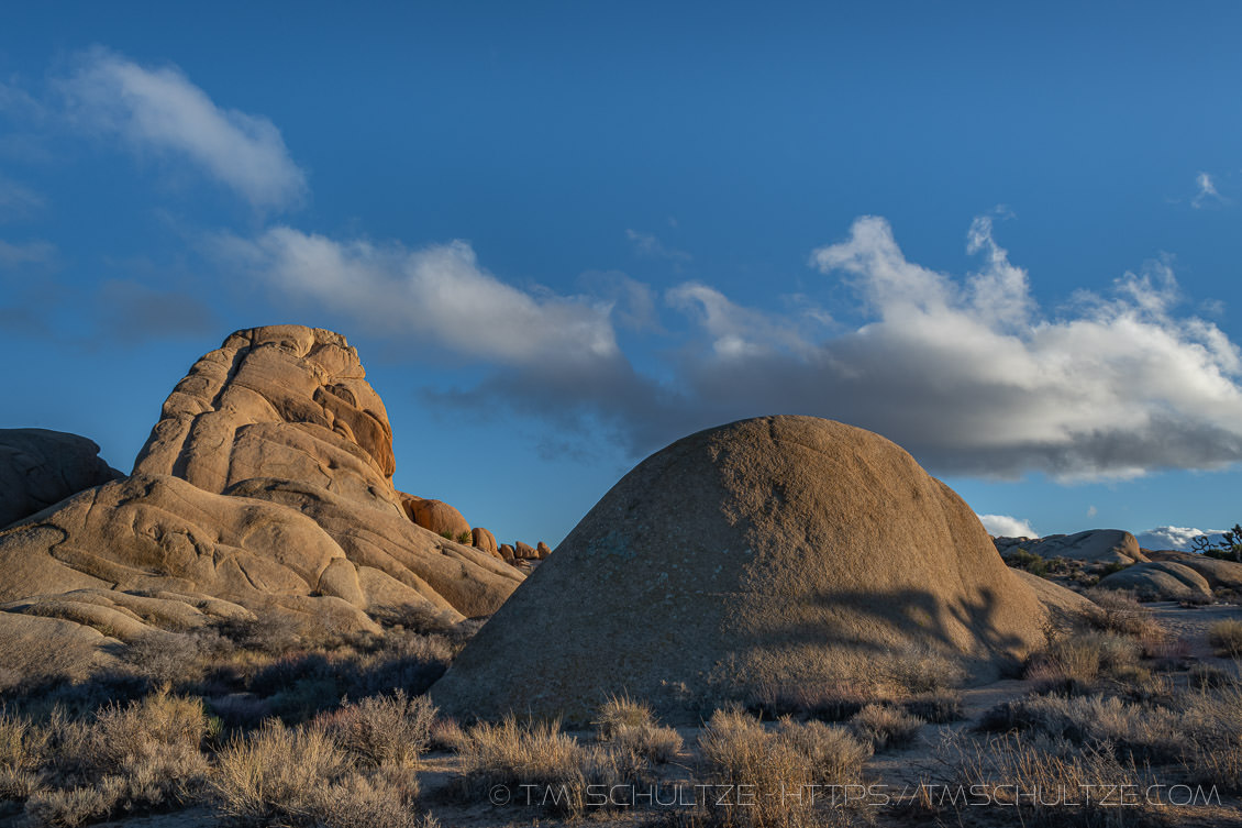 After that, I headed back to Jumbo Rocks.  Even without clouds, the rocks are always beautiful when light is at its longest.  I was pleased to see some clouds roll in to the South, and I composed a few images there.  Then, the sun hit the line of clouds to the West and everything went dark in an instant.