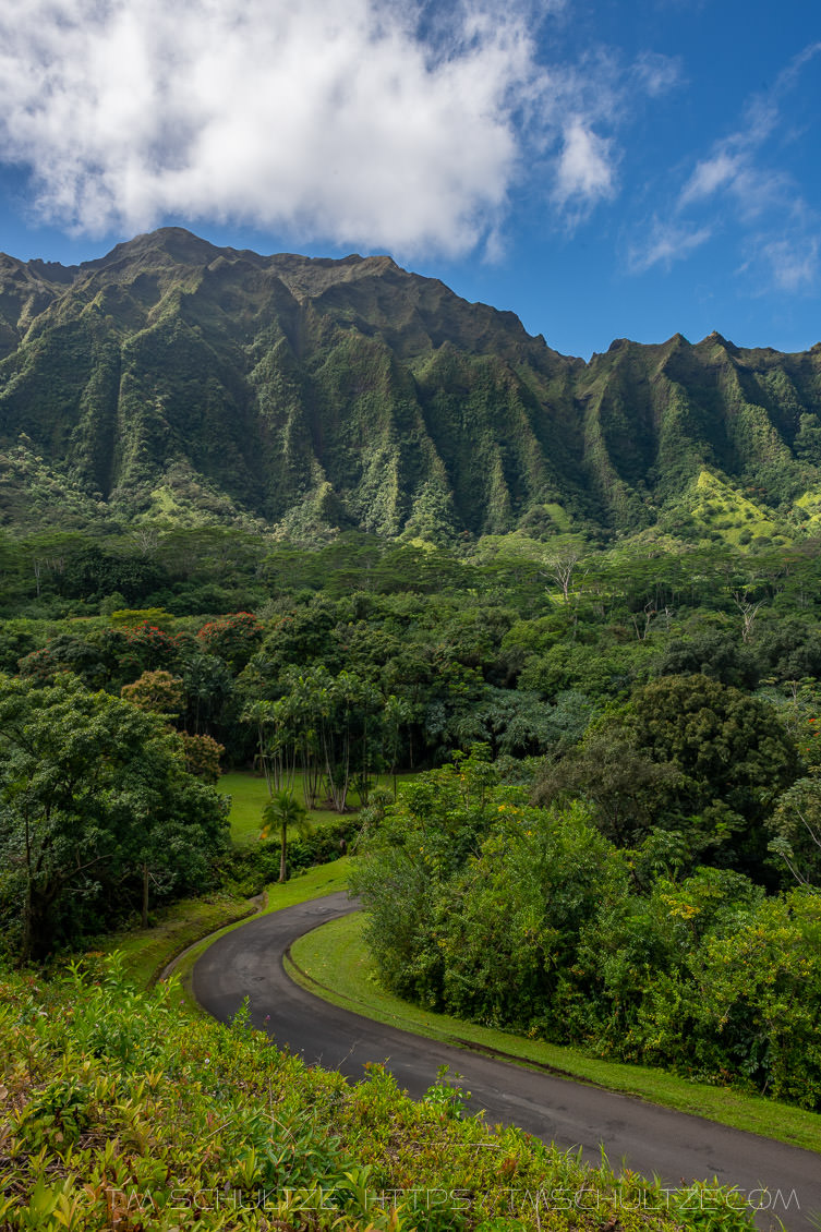 The garden is well managed and free admission (my kind of fee).  This was taken after a large storm.  My first thought was to get a photo of the beautiful lake (reservoir) that is a landmark in the garden and protects the communities of Kaneohe and Kailua from flooding.  The water was brown though, so I ended up back at this overlook.  Some may not consider it a landscape with the road, but I think it fits well.
