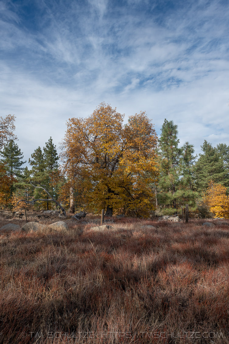 This year, the Laguna Mountains in San Diego County had very nice Fall Color. The mountain province is a pine forest with Black Oaks that grow intermittently throughout the pine forest. Some years are better than others. Often, some leaves turn at different times because Autumn in Southern California can bring temperatures between 30 and 90 degrees. It is rare to have good, consistent, temperatures that allow these oaks to turn at the same time.