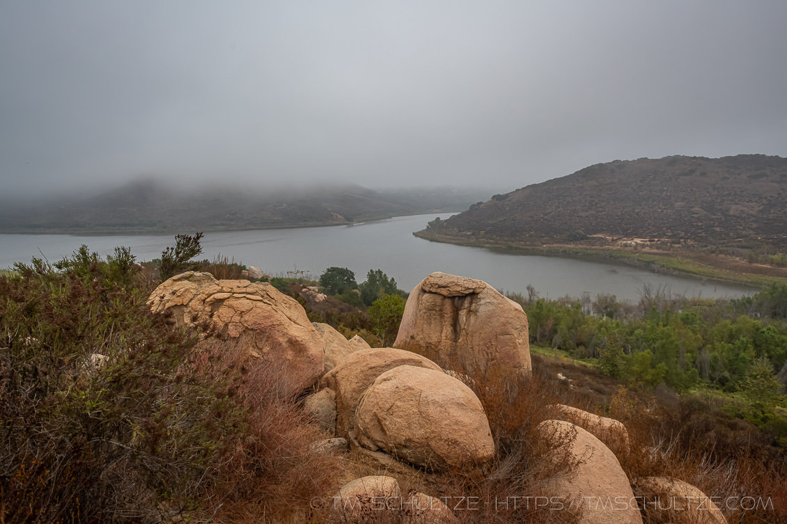 In this photograph, Lake Hodges is both beautiful and a good way to organize the composition. It is the marine layer’s companion, as it reflects much of the onshore flow. The lake also sets up the foreground with the foothills and visible portion of Bernardo Mountain.